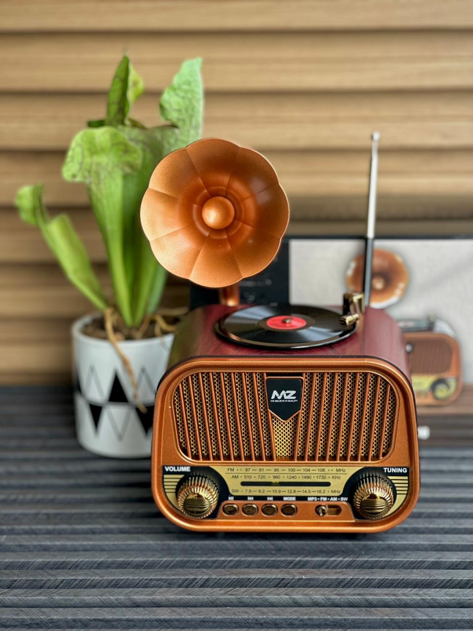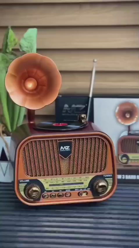 A portable audio player that blends nostalgic, vintage aesthetics with modern audio technology. It is designed to look like a classic radio with a decorative gramophone-style horn.